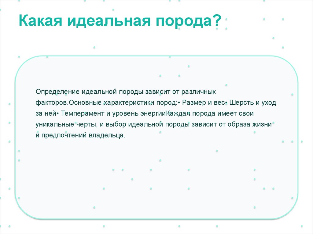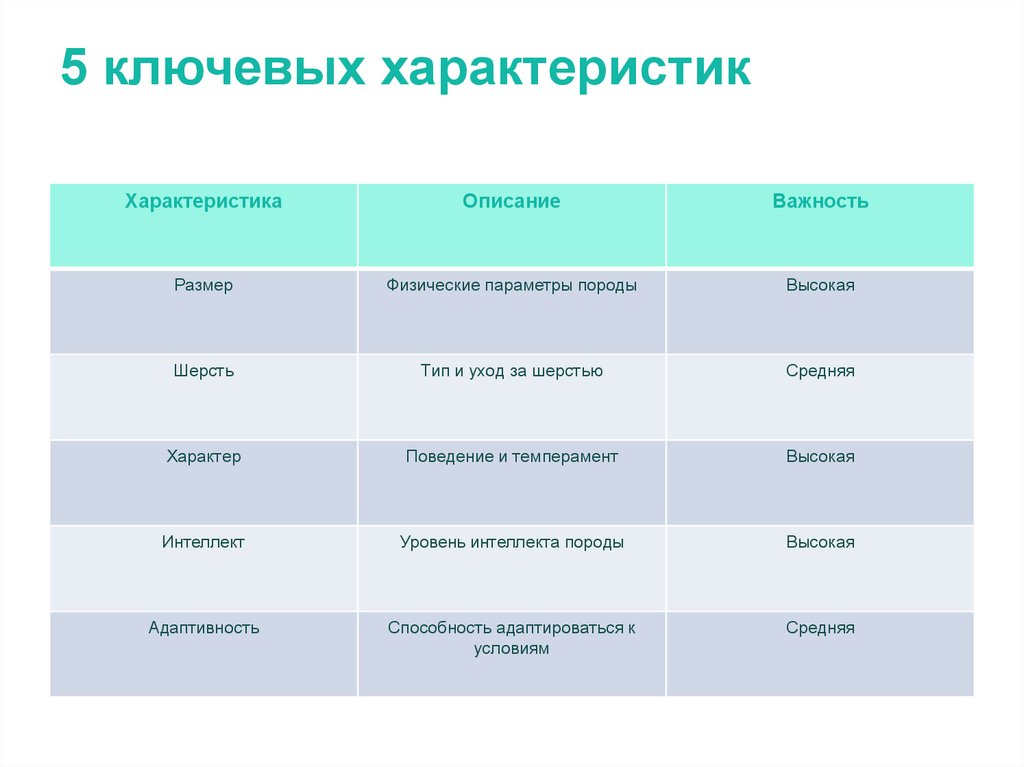 факторов.Основные характеристики пород:• Размер и вес• Шерсть и уход
