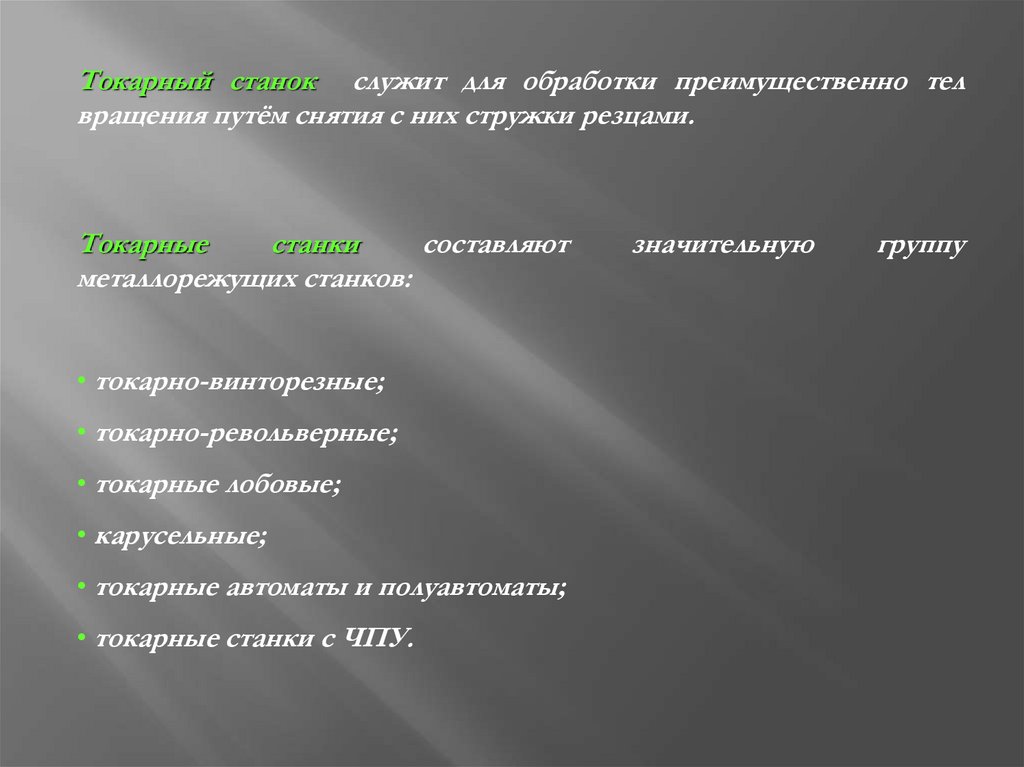 Токарный станок служит для обработки преимущественно телвращения путём снятия с них стружки резцами.