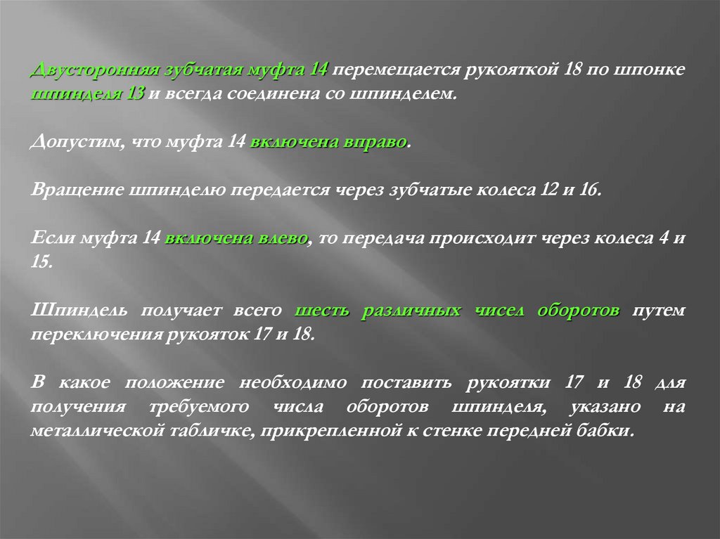 Двусторонняя зубчатая муфта 14 перемещается рукояткой 18 по шпонкешпинделя 13 и всегда соединена со шпинделем.