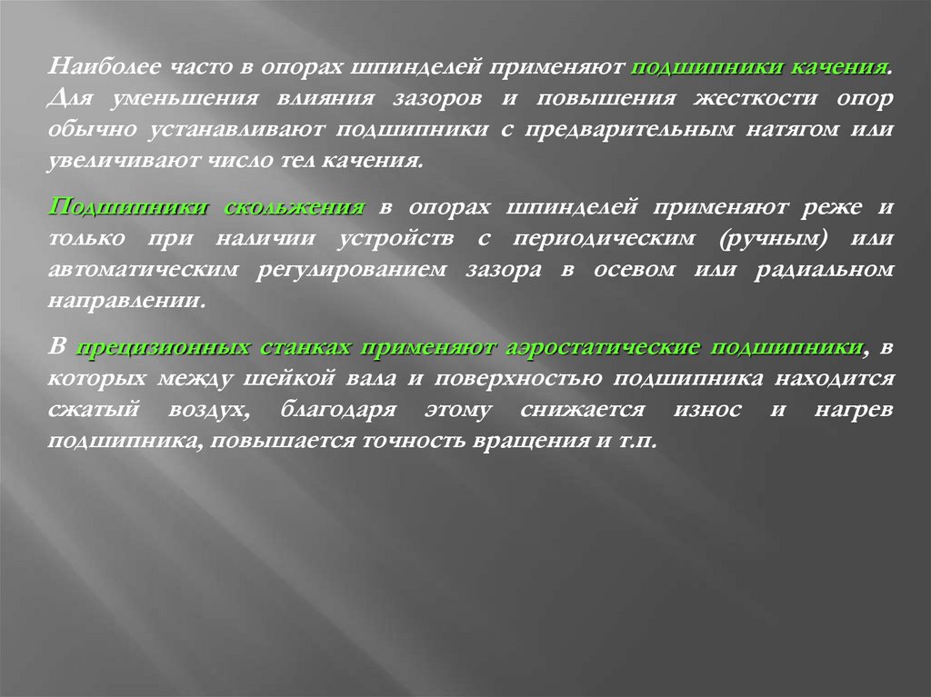Наиболее часто в опорах шпинделей применяют подшипники качения.Для уменьшения влияния зазоров и повышения жесткости опор