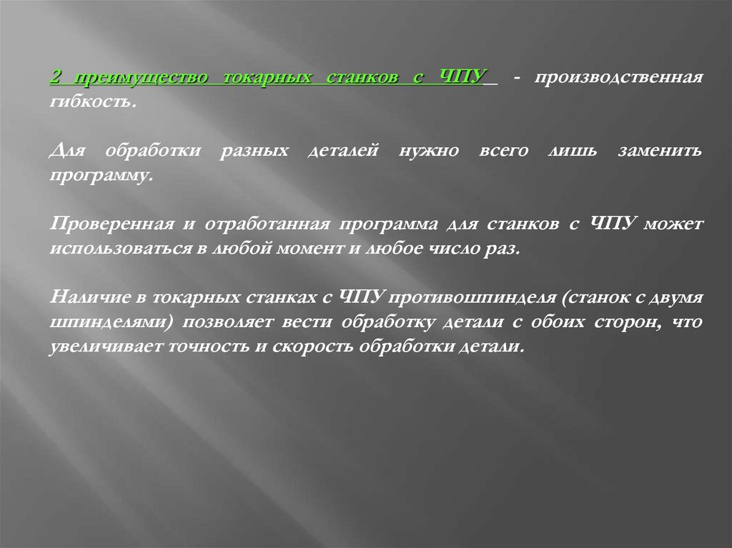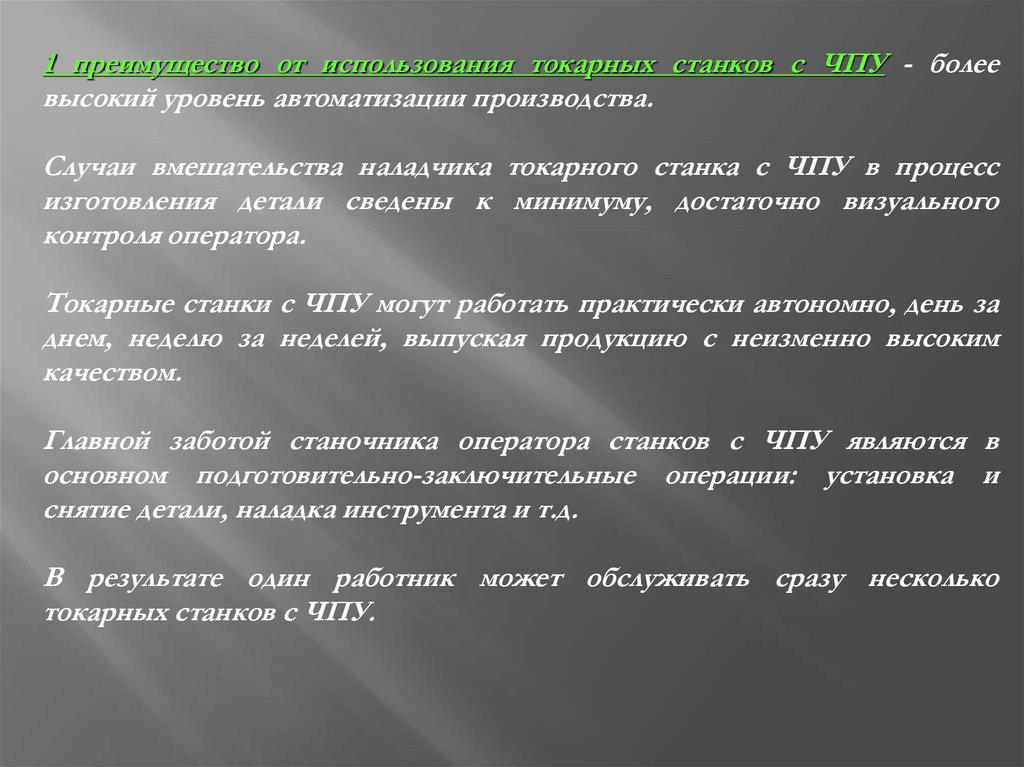 1 преимущество от использования токарных станков с ЧПУ - болеевысокий уровень автоматизации производства.