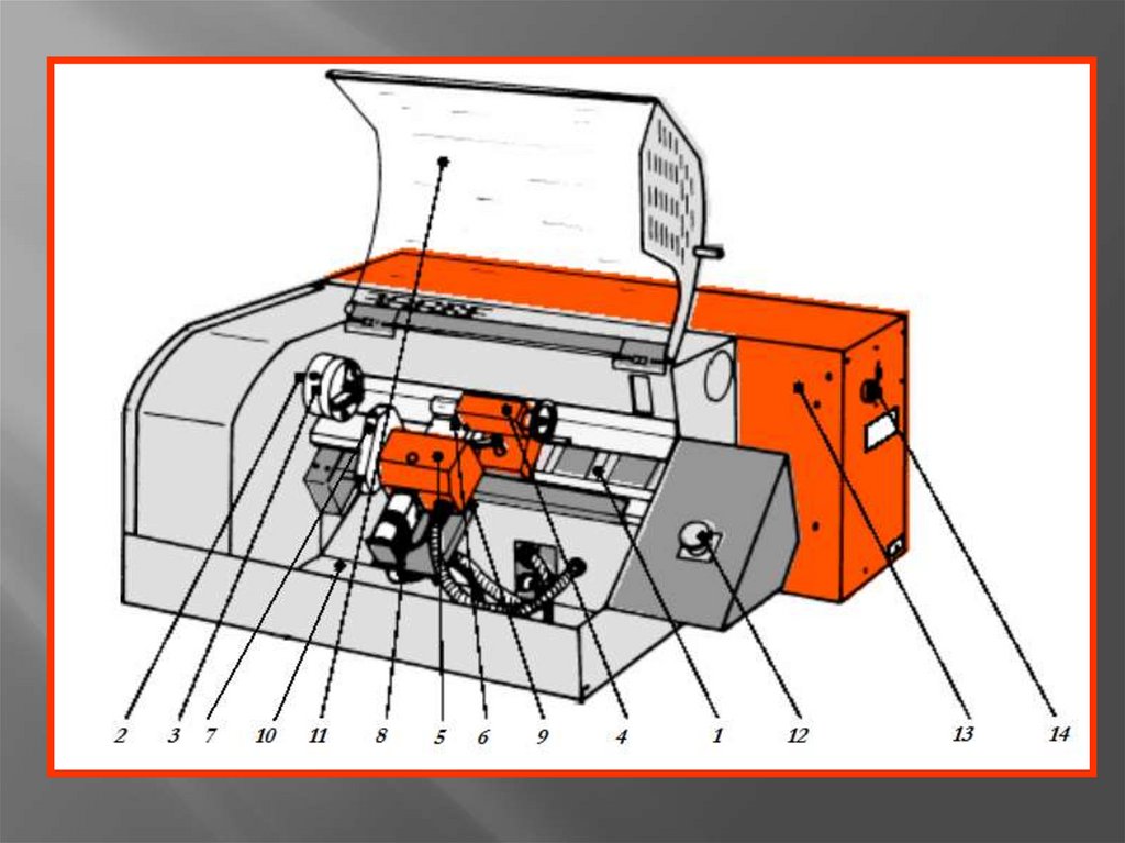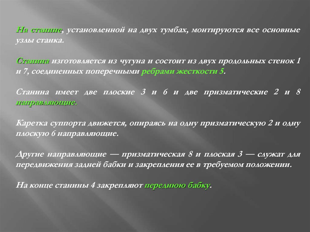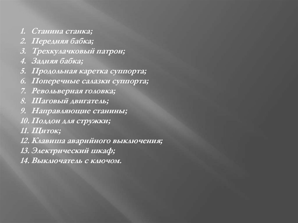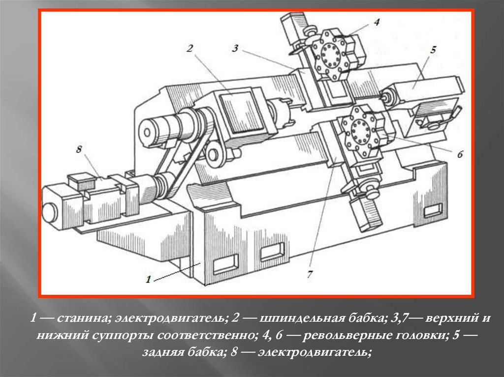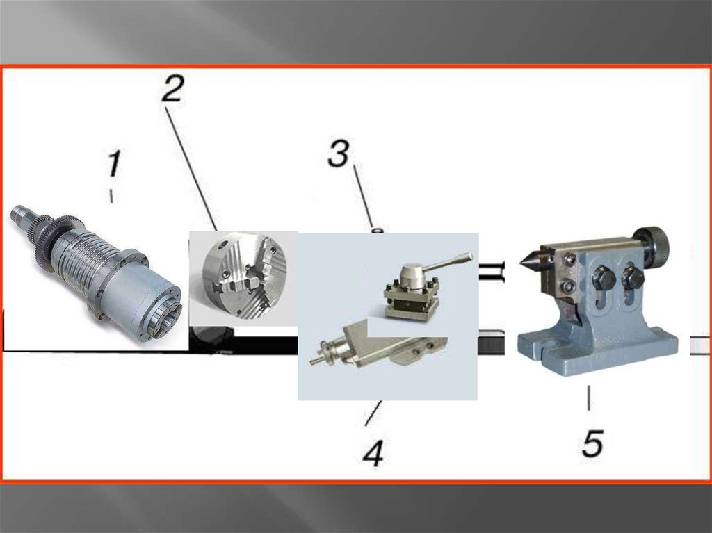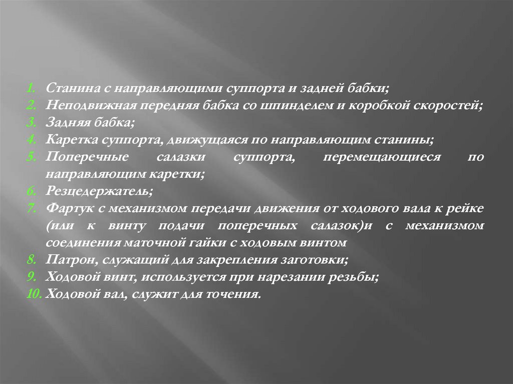 1. Станина с направляющими суппорта и задней бабки;2. Неподвижная передняя бабка со шпинделем и коробкой скоростей;