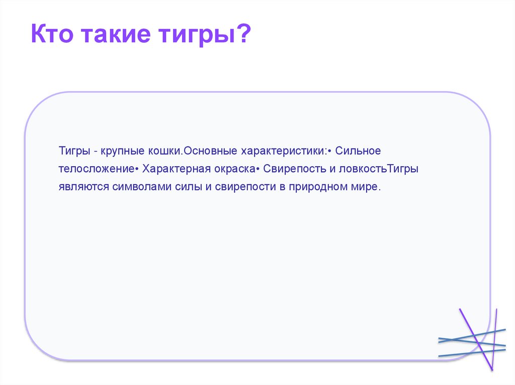 Кто такие тигры?Тигры - крупные кошки.Основные характеристики:• Сильное