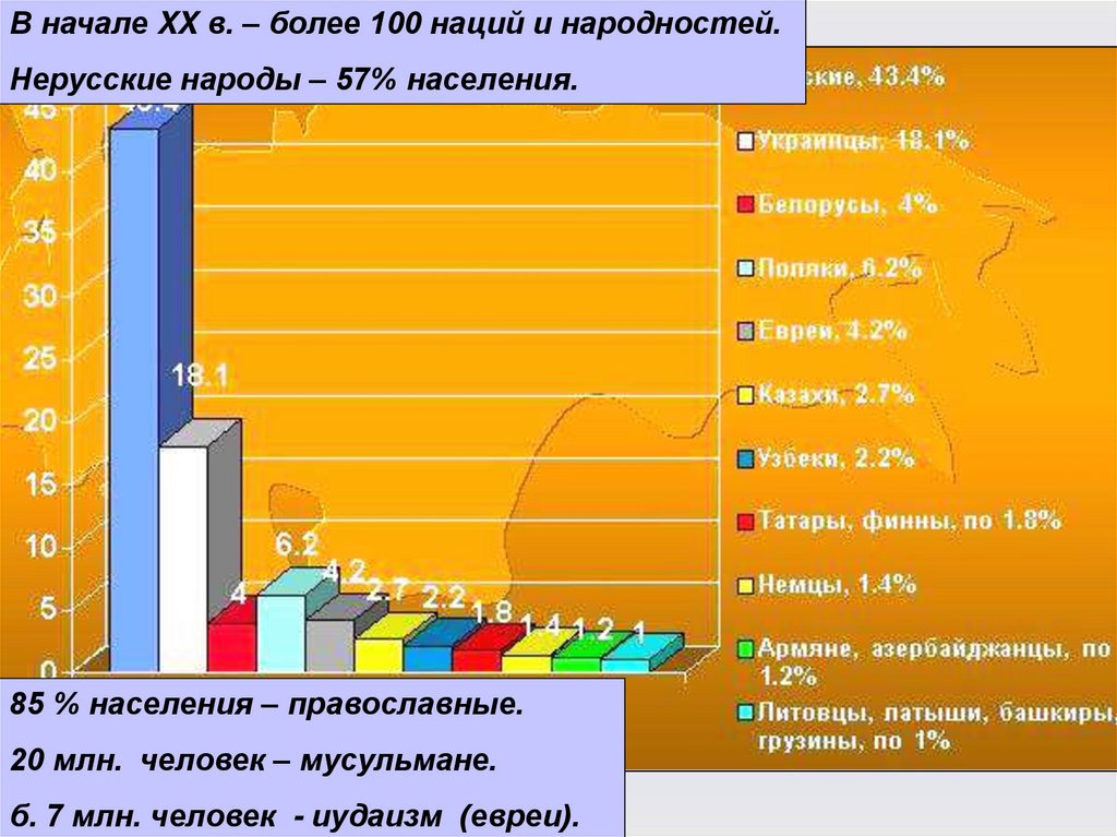 В начале XX в. – более 100 наций и народностей.Нерусские народы – 57% населения.