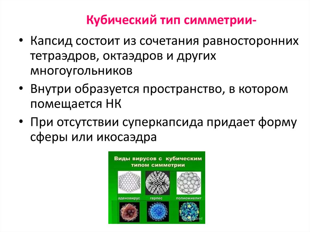Кубический тип симметрии• Капсид состоит из сочетания равностороннихтетраэдров, октаэдров и других