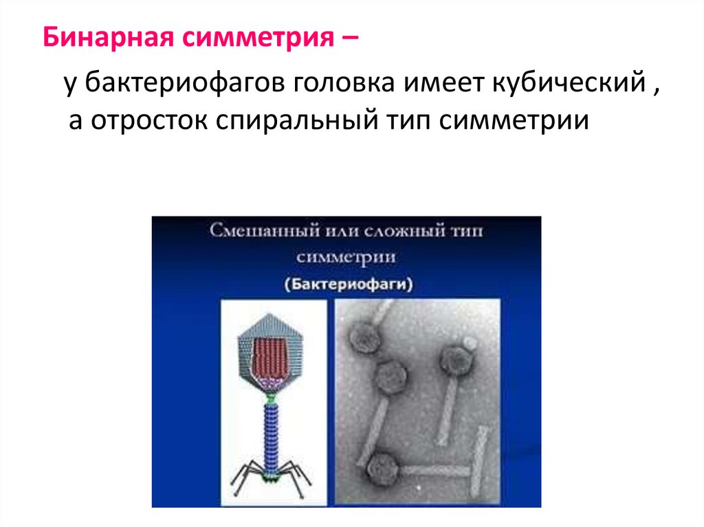 Бинарная симметрия –у бактериофагов головка имеет кубический ,