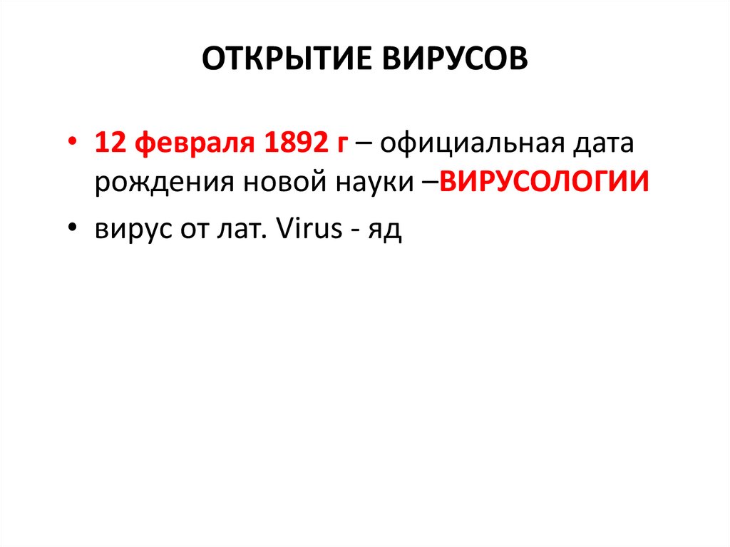 ОТКРЫТИЕ ВИРУСОВ• 12 февраля 1892 г – официальная дата