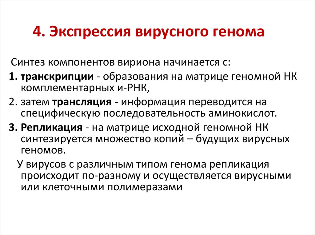 4. Экспрессия вирусного геномаСинтез компонентов вириона начинается с: