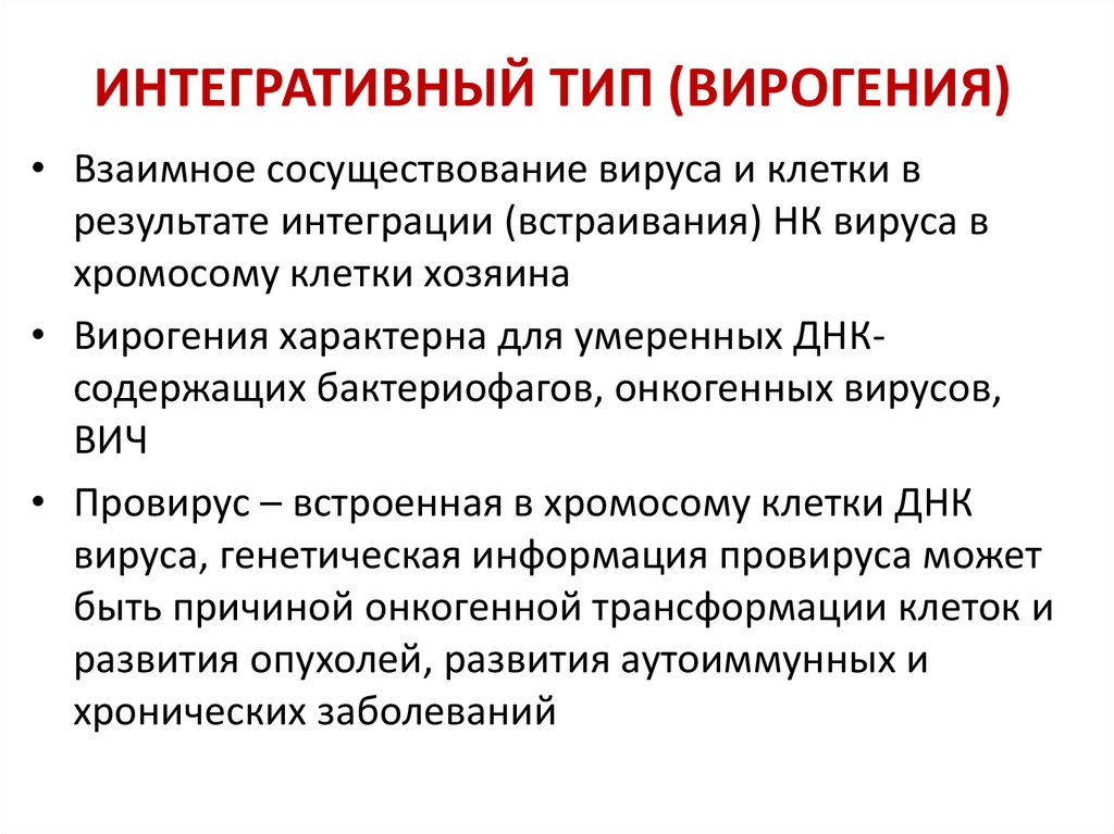 ИНТЕГРАТИВНЫЙ ТИП (ВИРОГЕНИЯ)• Взаимное сосуществование вируса и клетки в