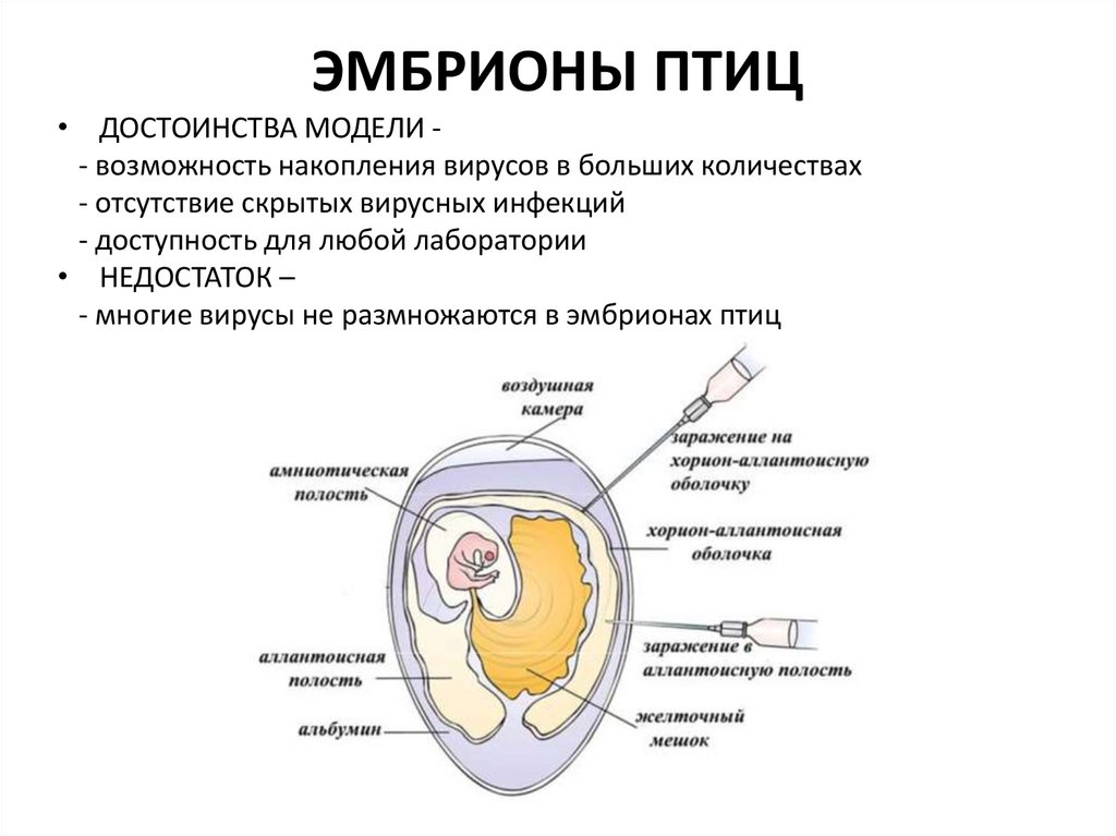 ЭМБРИОНЫ ПТИЦ• ДОСТОИНСТВА МОДЕЛИ - возможность накопления вирусов в больших количествах