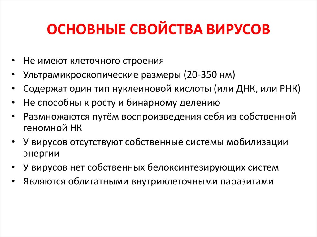 ОСНОВНЫЕ СВОЙСТВА ВИРУСОВНе имеют клеточного строения