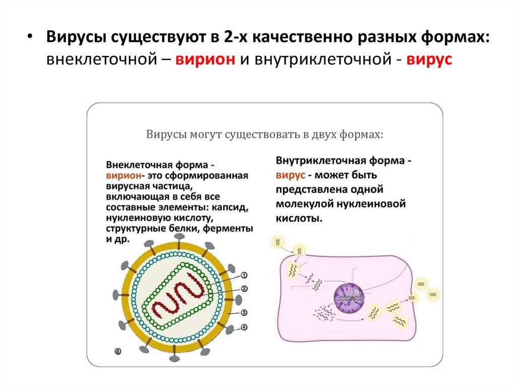 • Вирусы существуют в 2-х качественно разных формах:внеклеточной – вирион и внутриклеточной - вирус