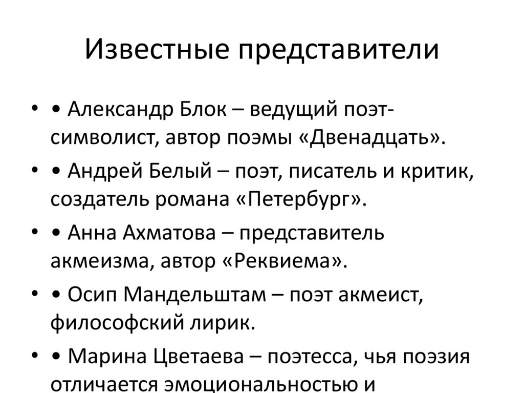 Известные представители• • Александр Блок – ведущий поэтсимволист, автор поэмы «Двенадцать».