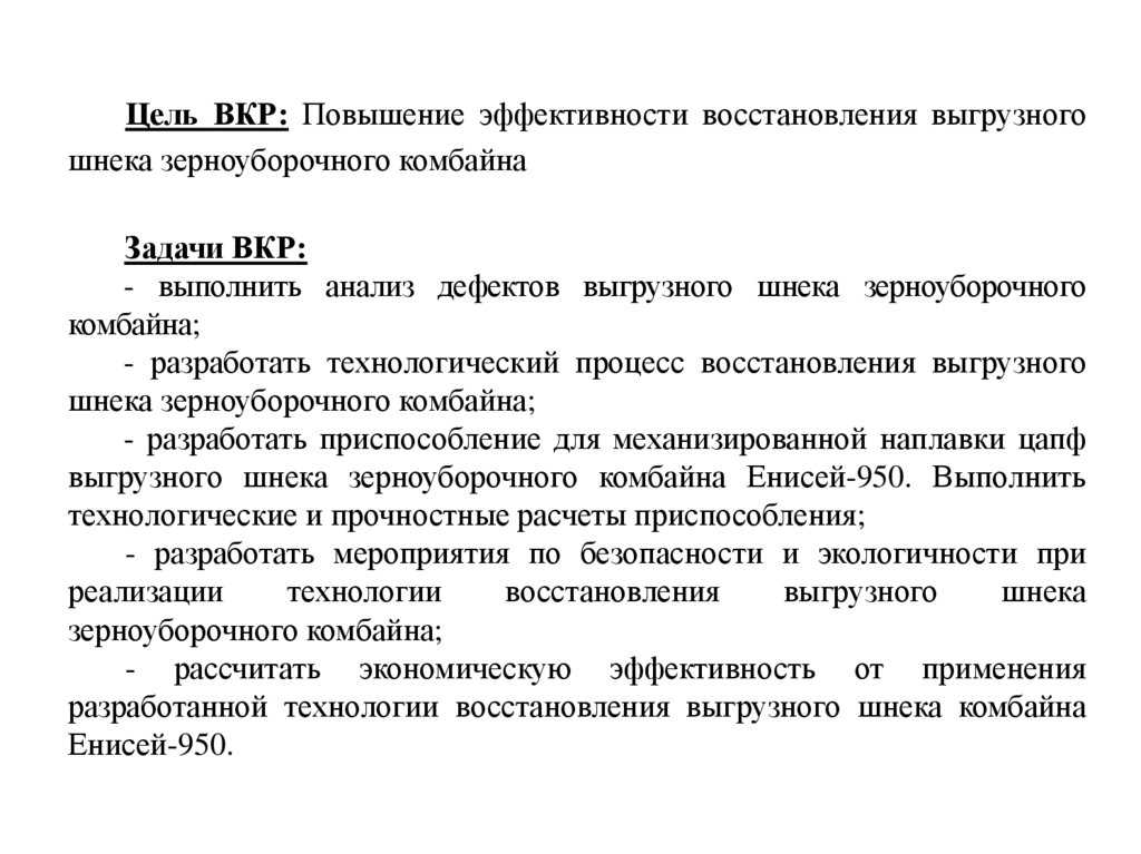 Цель ВКР: Повышение эффективности восстановления выгрузногошнека зерноуборочного комбайна