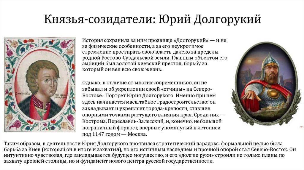 забывал и об укреплении своей «отчины» на СевероВостоке. Портрет Юрия Долгорукого Именно при нем