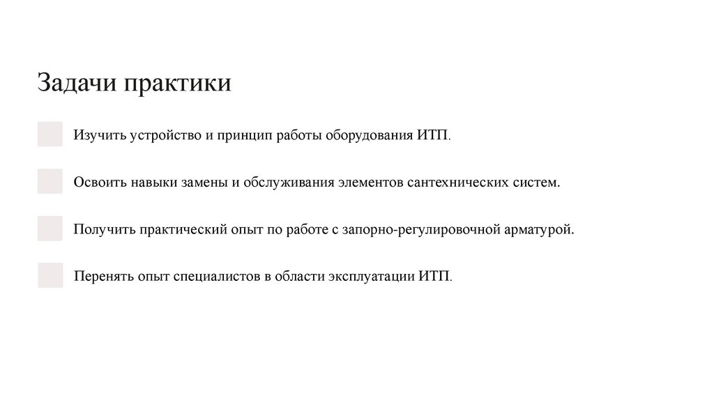 Задачи практикиИзучить устройство и принцип работы оборудования ИТП.