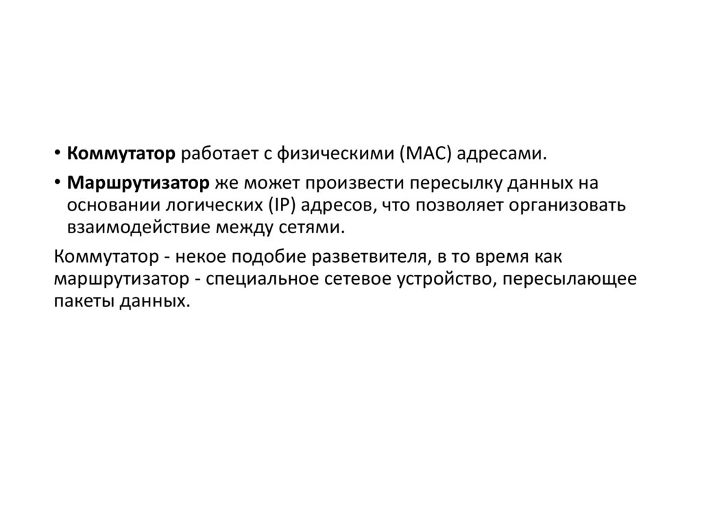 Коммутатор (switch функционирует на канальном (втором) уровнемодели OSI и служит для объединения сетевых устройств в пределах