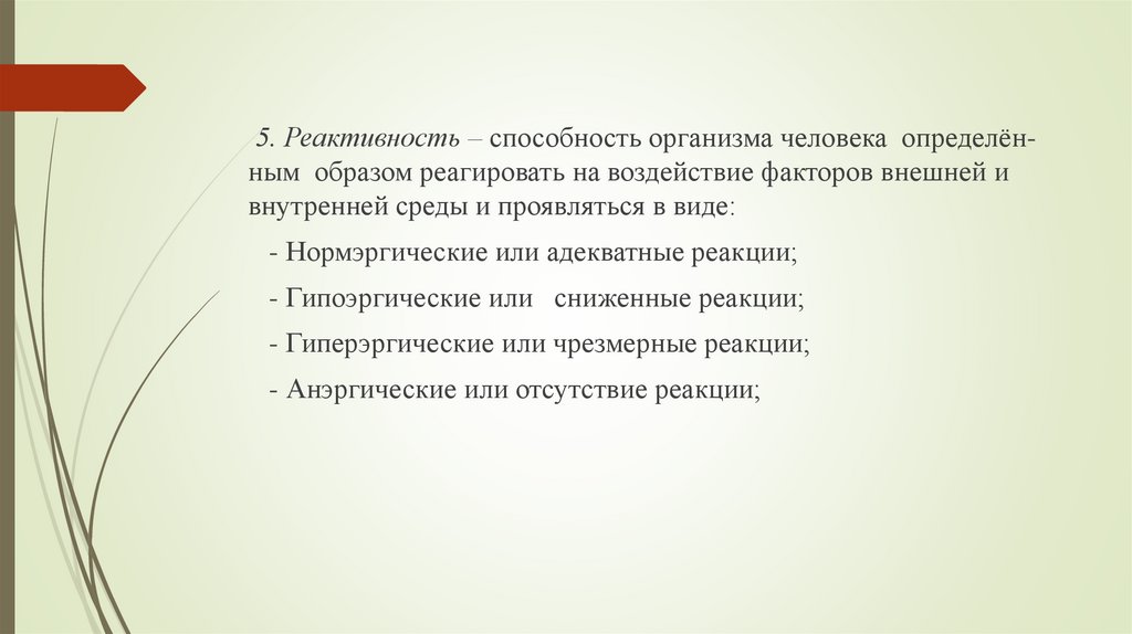 5. Реактивность – способность организма человека определённым образом реагировать на воздействие факторов внешней ивнутренней среды и проявляться в виде: