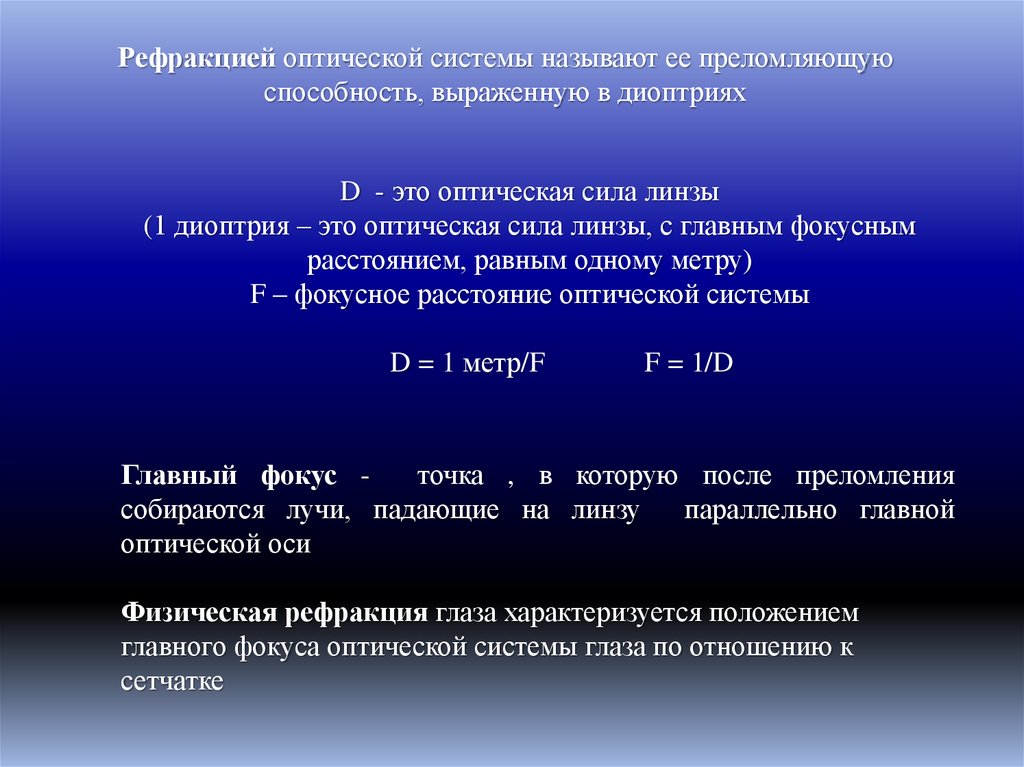 Физическая рефракция – преломляющая сила оптическойсистемы глаза, выраженная в диоптриях