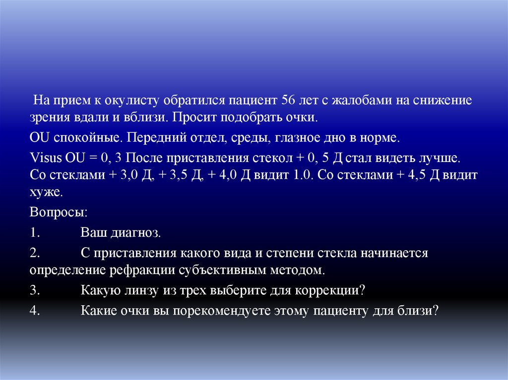 На прием к окулисту обратился пациент 56 лет с жалобами на снижениезрения вдали и вблизи. Просит подобрать очки.