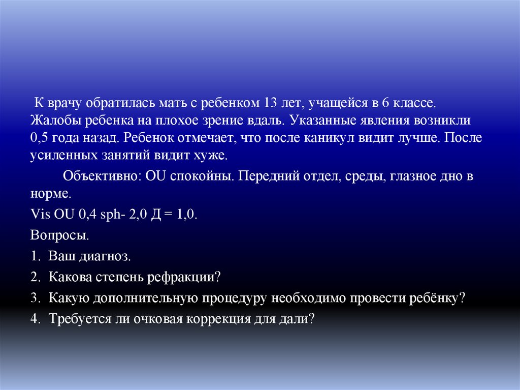 К врачу обратилась мать с ребенком 13 лет, учащейся в 6 классе.Жалобы ребенка на плохое зрение вдаль. Указанные явления возникли