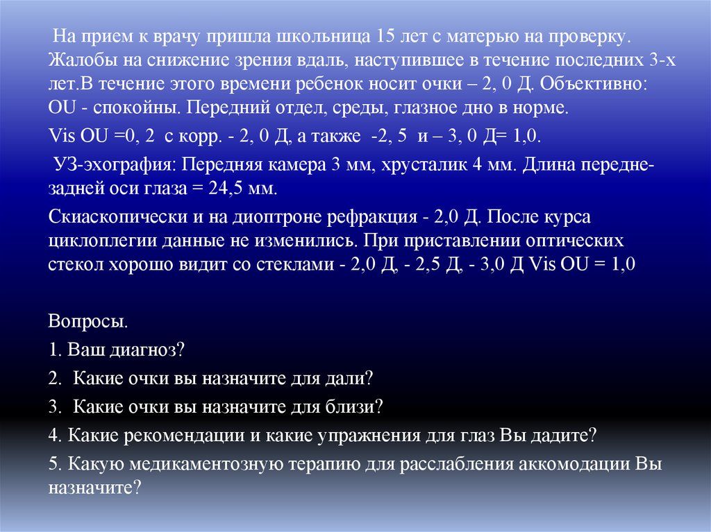 На прием к врачу пришла школьница 15 лет с матерью на проверку.Жалобы на снижение зрения вдаль, наступившее в течение последних 3-х