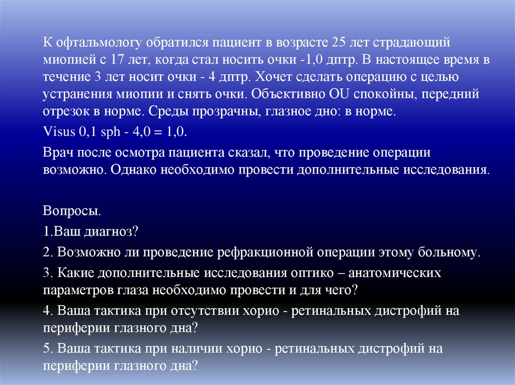 К офтальмологу обратился пациент в возрасте 25 лет страдающиймиопией с 17 лет, когда стал носить очки -1,0 дптр. В настоящее время в