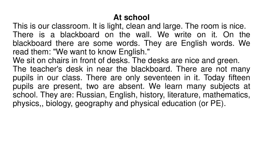 At schoolThis is our classroom. It is light, clean and large. The room is nice.