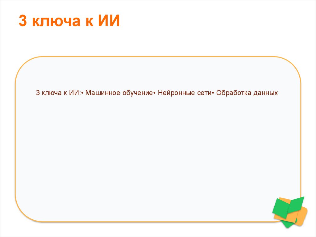 3 ключа к ИИ3 ключа к ИИ:• Машинное обучение• Нейронные сети• Обработка данных
