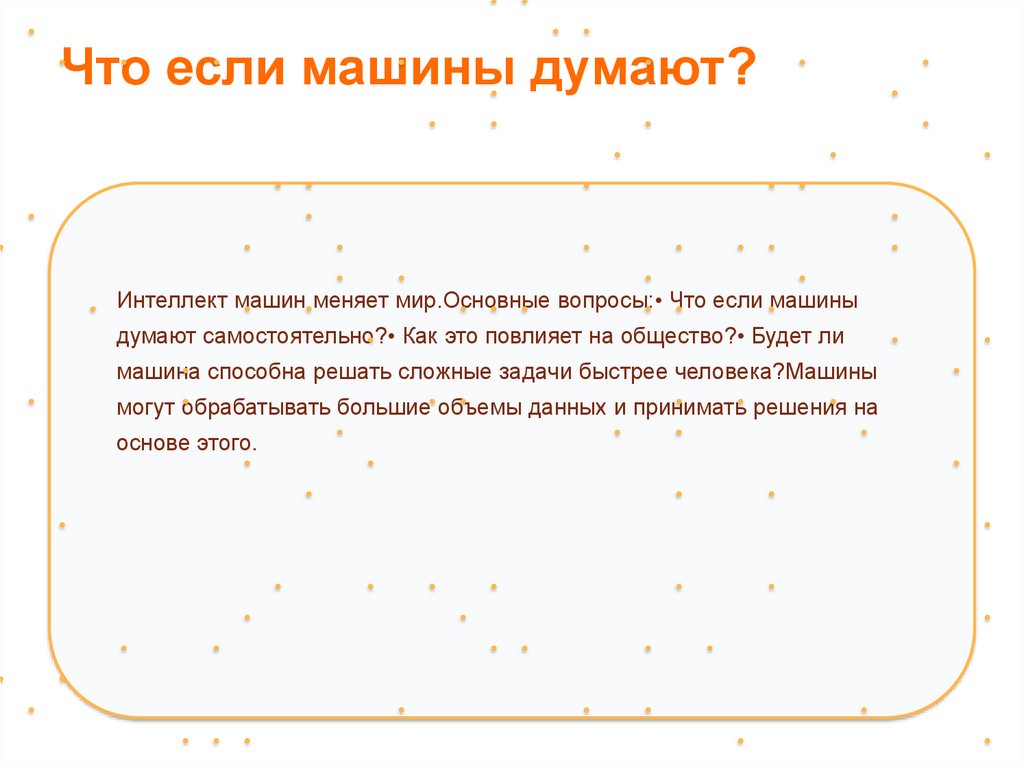 Что если машины думают?Интеллект машин меняет мир.Основные вопросы:• Что если машины