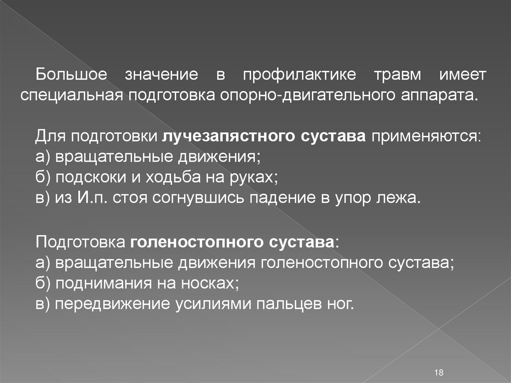 Большое значение в профилактике травм имеетспециальная подготовка опорно-двигательного аппарата.