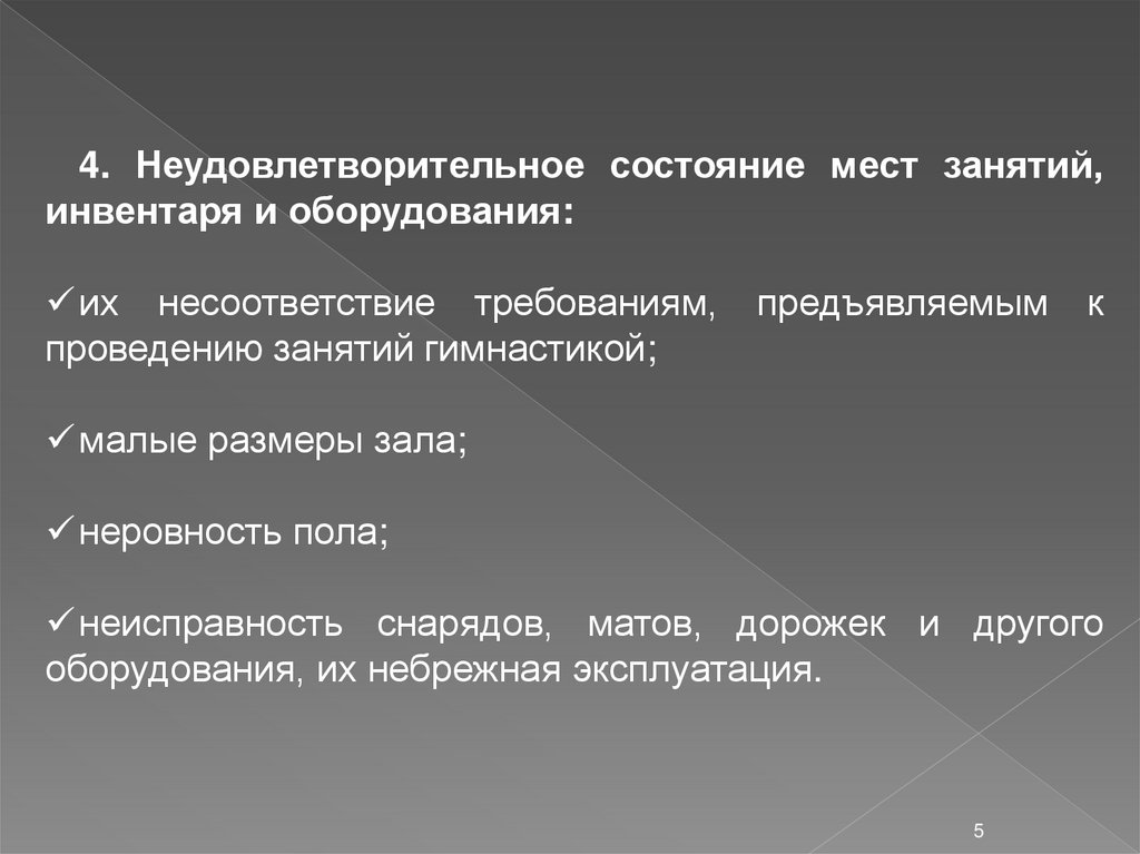4. Неудовлетворительное состояние мест занятий,инвентаря и оборудования: