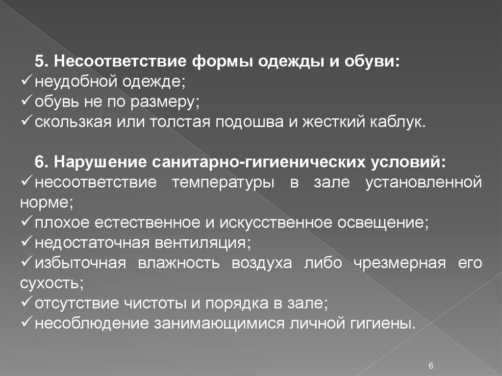5. Несоответствие формы одежды и обуви:неудобной одежде;