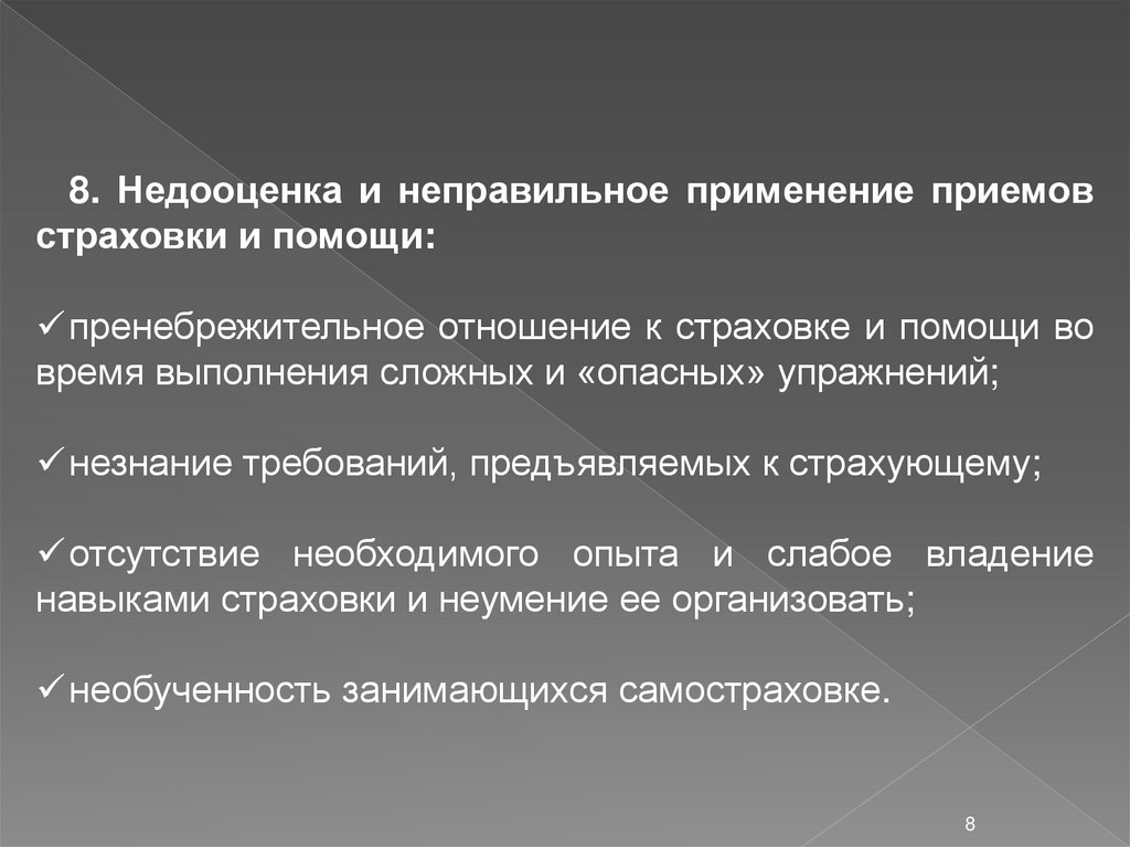 8. Недооценка и неправильное применение приемовстраховки и помощи: