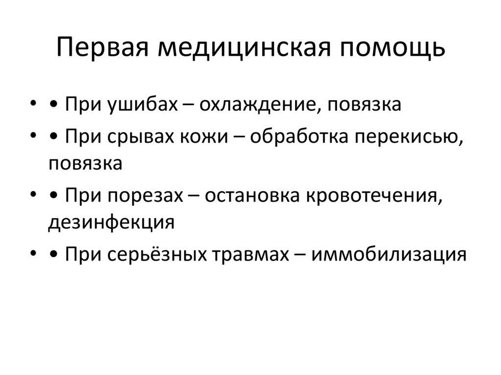 Первая медицинская помощь• • При ушибах – охлаждение, повязка