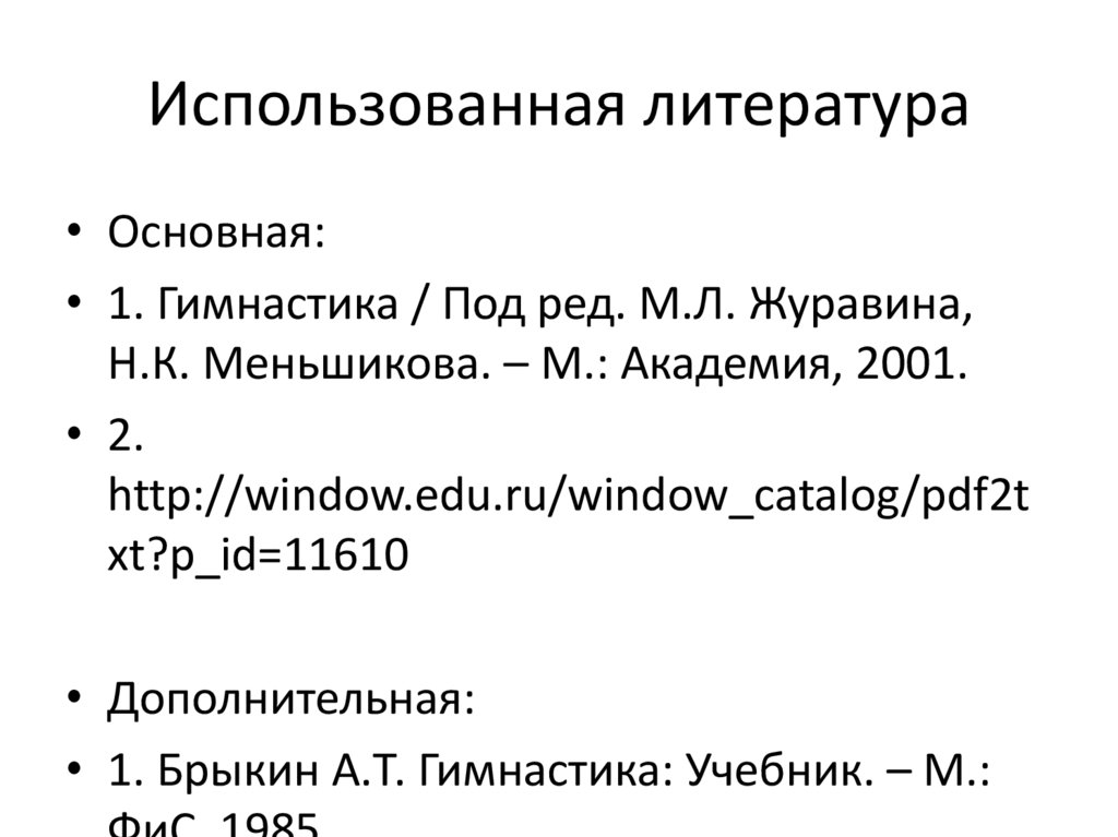 • 1. Брыкин А.Т. Гимнастика: Учебник. – М.: