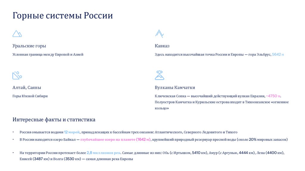 Территория России характеризуется сложным и разнообразным рельефом, где преобладают равнины, но также представлены величественные горные