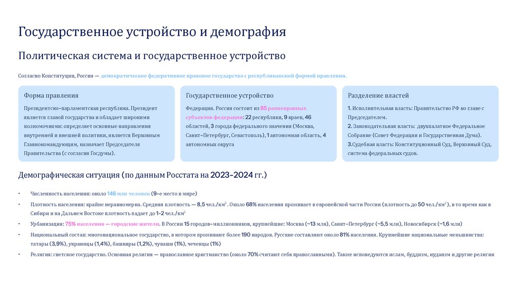 Урбанизация: 75% населения — городские жители. В России 15 городов-миллионников, крупнейшие: Москва (~13 млн), Санкт-Петербург (~5,5 млн), Новосибирск (~1,6 млн)
