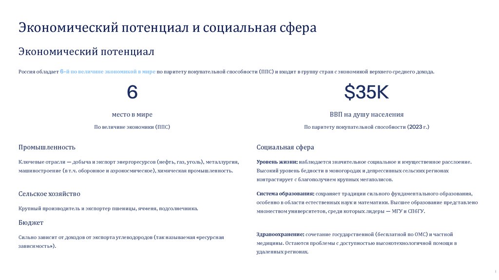 Россия обладает 6-й по величине экономикой в мире по паритету покупательной способности (ППС) и входит в группу стран с экономикой верхнего среднего дохода.