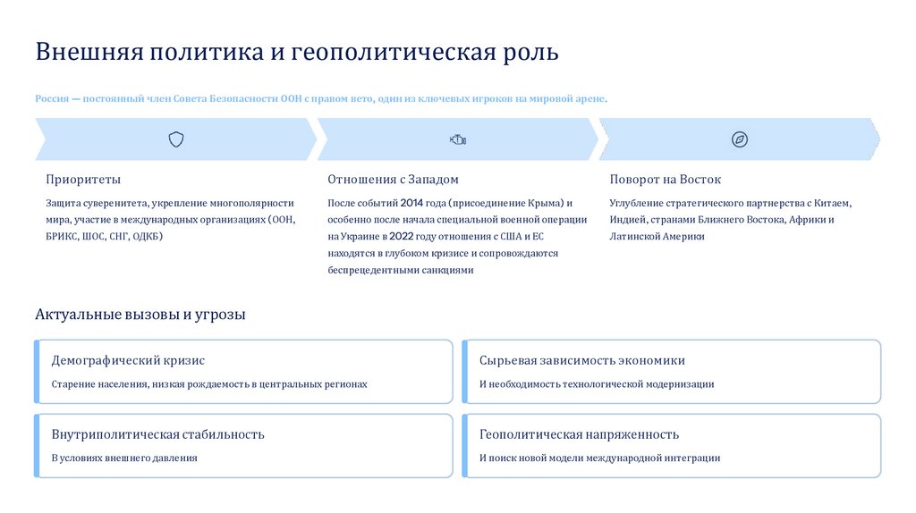 Внешняя политика и геополитическая рольРоссия — постоянный член Совета Безопасности ООН с правом вето, один из ключевых игроков на мировой арене.