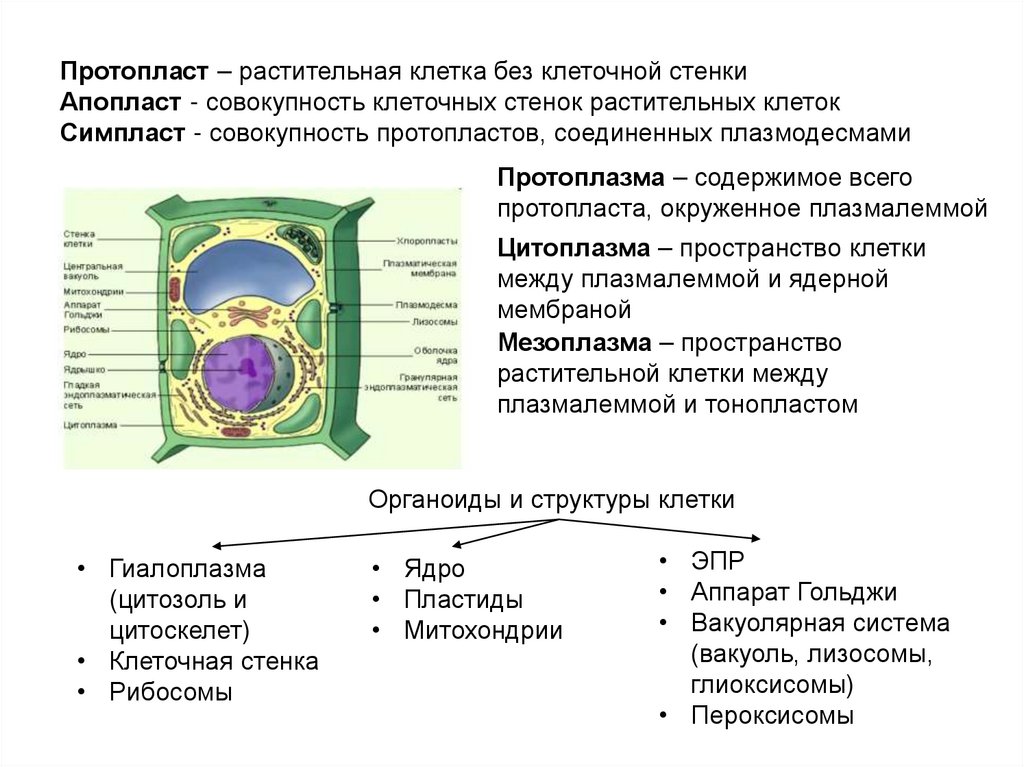 Протопласт – растительная клетка без клеточной стенкиАпопласт - совокупность клеточных стенок растительных клеток