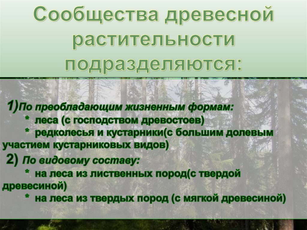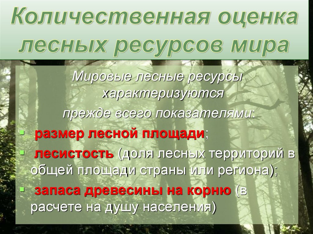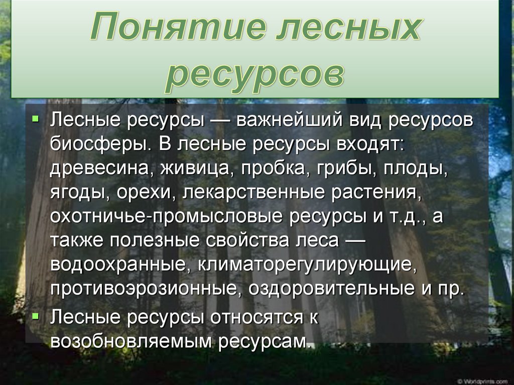Лесные ресурсы — важнейший вид ресурсовбиосферы. В лесные ресурсы входят: