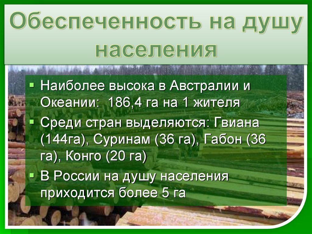 Наиболее высока в Австралии иОкеании: 186,4 га на 1 жителя