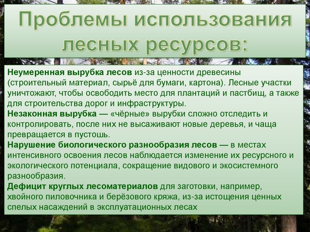 Неумеренная вырубка лесов из-за ценности древесины(строительный материал, сырьё для бумаги, картона). Лесные участки
