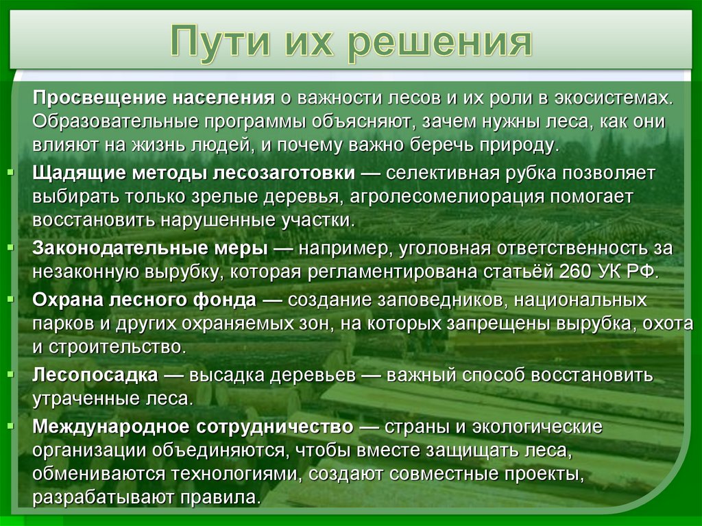 Просвещение населения о важности лесов и их роли в экосистемах.Образовательные программы объясняют, зачем нужны леса, как они