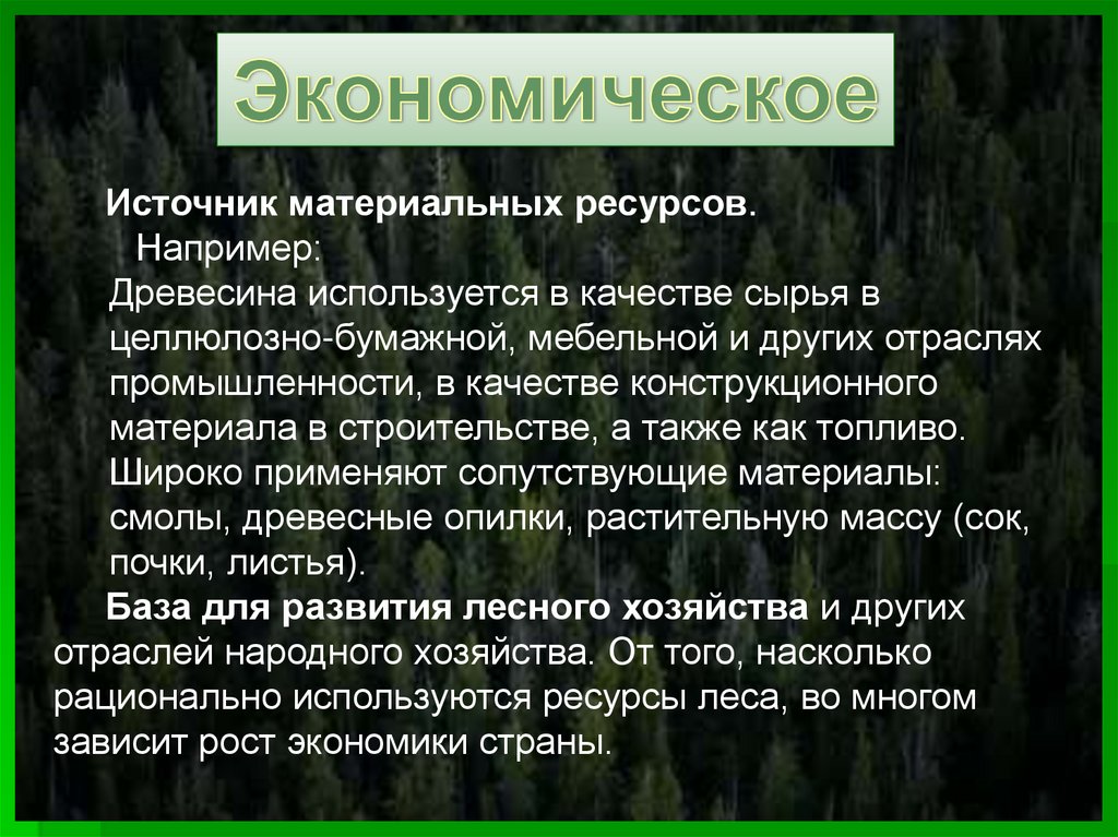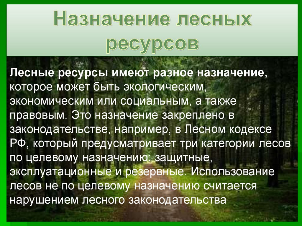 Лесные ресурсы имеют разное назначение,которое может быть экологическим,