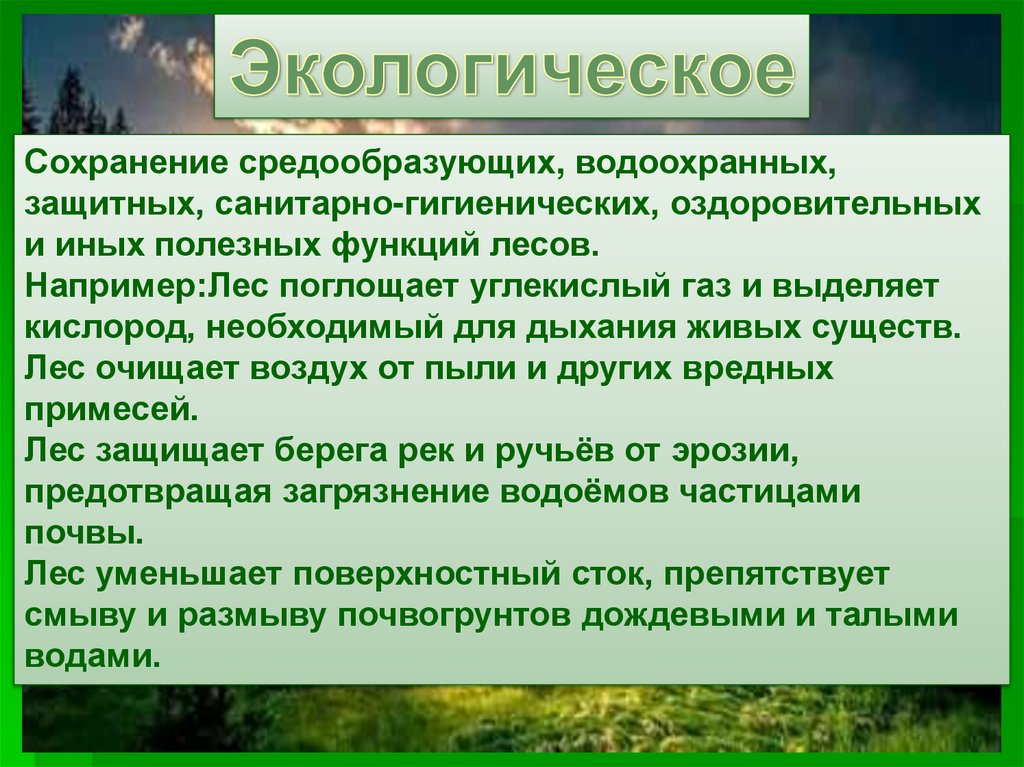 Сохранение средообразующих, водоохранных,защитных, санитарно-гигиенических, оздоровительных