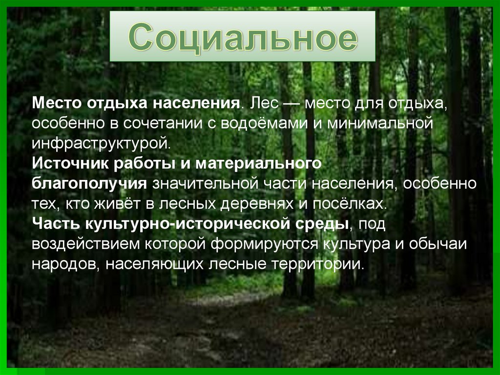 Место отдыха населения. Лес — место для отдыха,особенно в сочетании с водоёмами и минимальной