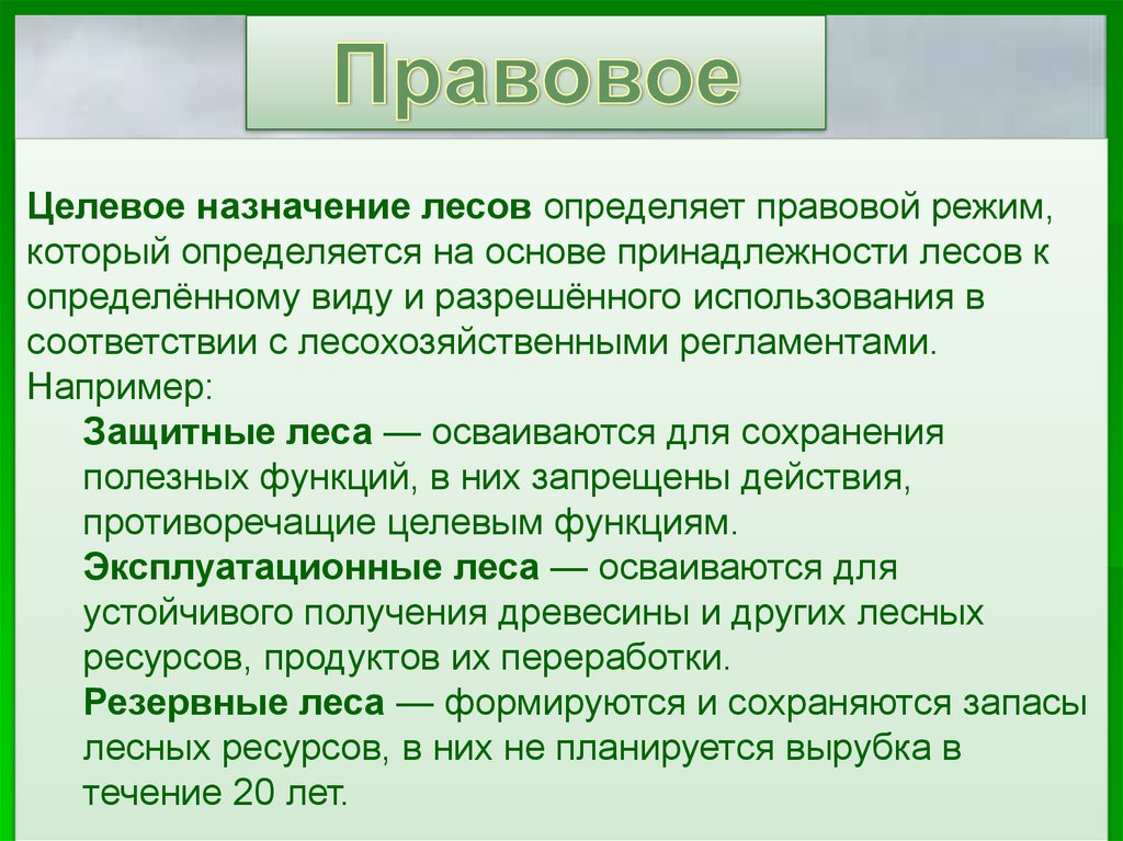 Целевое назначение лесов определяет правовой режим,который определяется на основе принадлежности лесов к