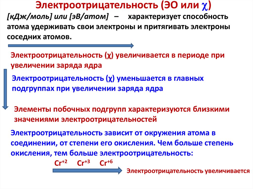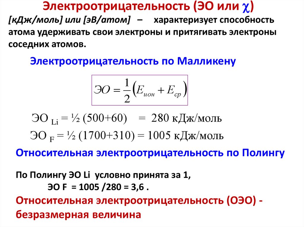 Электроотрицательность (ЭО или )[кДж/моль] или [эВ/атом] – характеризует способность